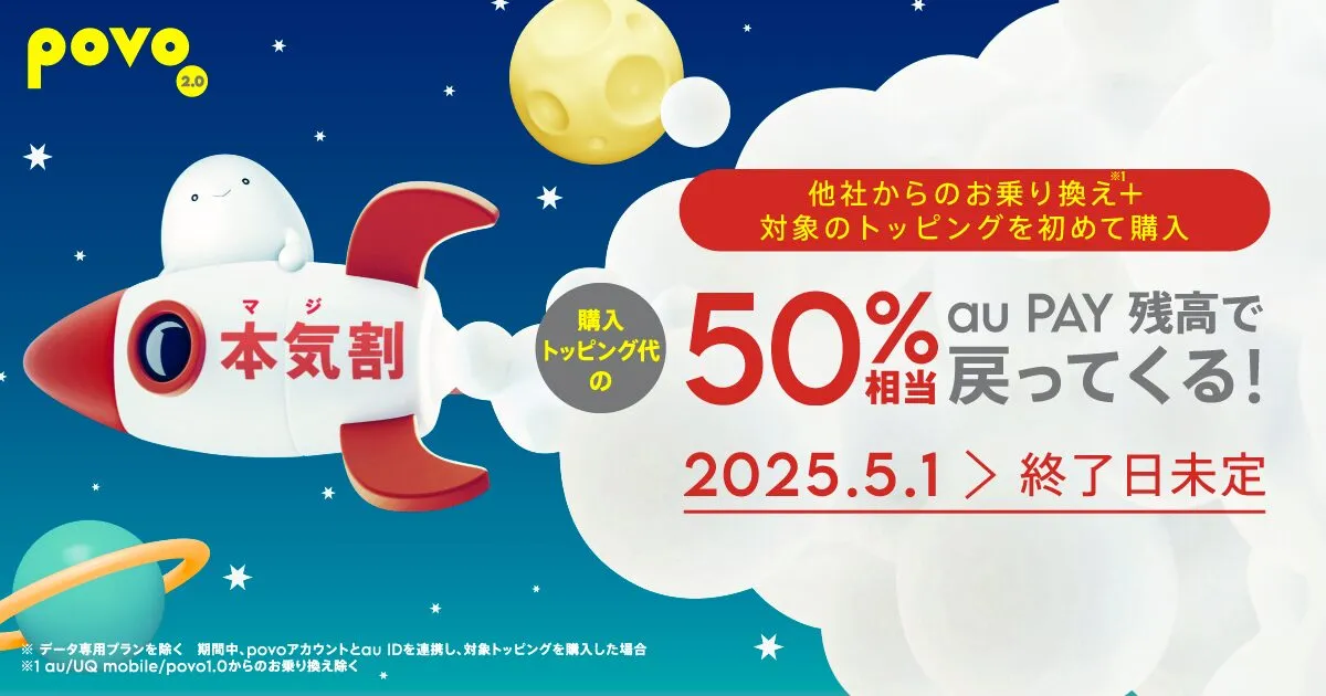 ![]() 本気割キャンペーン | 年間トッピング購入でau PAY残高で戻ってくる! 大容量の年間トッピングを購入するとその金額の50%相当がau PAY残高として還元されます。 対象:他社から乗り換え 期間:2026年3月31日まで |